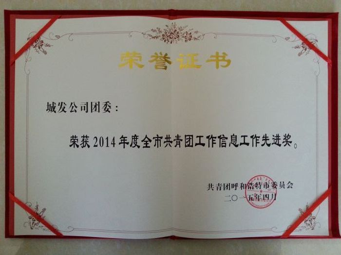 201543,在共青團(tuán)呼和浩特市十六屆二次全委(擴(kuò)大)會(huì)暨少工委五屆五次全委(擴(kuò)大)會(huì)議上,城發(fā)公司團(tuán)委榮獲“2014年度全市共青團(tuán)工作信息工作先進(jìn)獎(jiǎng)”。