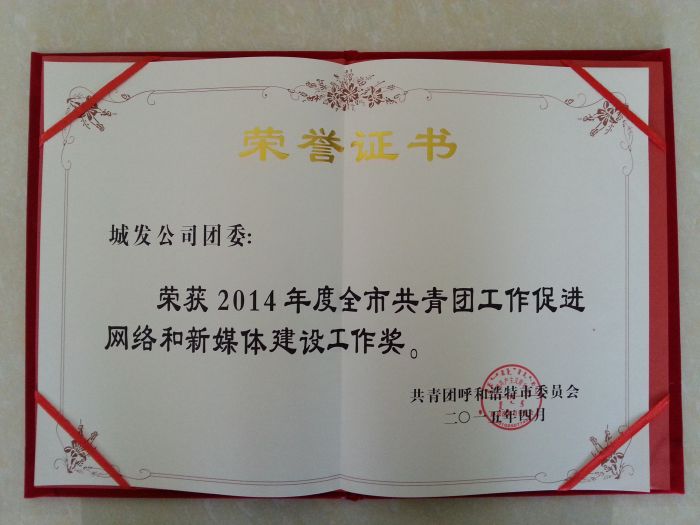 2015年4月3日,在共青團(tuán)呼和浩特市十六屆二次全委(擴(kuò)大)會(huì)暨少工委五屆五次全委(擴(kuò)大)會(huì)議上,城發(fā)公司團(tuán)委榮獲“2014年度全市共青團(tuán)工作促進(jìn)網(wǎng)絡(luò)和新媒體建設(shè)工作獎(jiǎng)”。