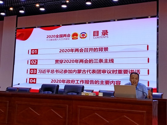 孫忠輝副教授以2020年全國兩會精神為專題,分別對2020年兩會召開的背景、貫穿2020年兩會的三條主線、習(xí)近平總書記參加內(nèi)蒙古代表團(tuán)審議時重要講話、2020年政府工作報告的主要內(nèi)容做了深入的解讀與細(xì)致的講解。兩會號召全國各族人民要更加緊密地團(tuán)結(jié)在以習(xí)近平同志為核心的黨中央周圍,高舉中國特色社會主義偉大旗幟,以習(xí)近平新時代中國特色社會主義思想為指導(dǎo),全面貫徹黨的十九大和十九屆二中、三中、四中全會精神,堅(jiān)決貫徹黨的基本理論、基本路線、基本方略,增強(qiáng)“四個意識”、堅(jiān)定“四個自信”、做到“兩個維護(hù)”,緊扣全面建成小康社會目標(biāo)任務(wù),統(tǒng)籌推進(jìn)疫情防控和經(jīng)濟(jì)社會發(fā)展工作,在疫情防控常態(tài)化前提下,堅(jiān)持穩(wěn)中求進(jìn)工作總基調(diào),堅(jiān)持新發(fā)展理念,堅(jiān)持以供給側(cè)結(jié)構(gòu)性改革為主線,堅(jiān)持以改革開放為動力推動高質(zhì)量發(fā)展,堅(jiān)決打好三大攻堅(jiān)戰(zhàn),加大“六穩(wěn)”工作力度,全面落實(shí)“六保”任務(wù),堅(jiān)定實(shí)施擴(kuò)大內(nèi)需戰(zhàn)略,維護(hù)經(jīng)濟(jì)發(fā)展和社會穩(wěn)定大局,同心協(xié)力,攻堅(jiān)克難,銳意進(jìn)取,確保完成決戰(zhàn)決勝脫貧攻堅(jiān)目標(biāo)任務(wù),全面建成小康社會。同時闡明了中華民族向來不畏艱難險阻、當(dāng)代中國人民有戰(zhàn)勝任何挑戰(zhàn)的堅(jiān)定意志和能力。