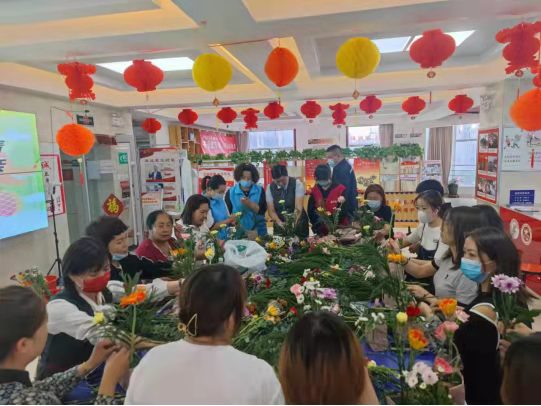活動現場,來自企業(yè)、社區(qū)的各族職工、居民興致勃勃地與花藝師交流互動,請教一些插花方面的專業(yè)知識,并在老師的講解示范下,創(chuàng)作自己的作品。一枝一葉通過他們的精心構思化作了一個個造型優(yōu)美、寓意豐富、活靈活現的濃縮景觀,寄托著他們對幸福生活的由衷贊美;一花一蕊通過他們的精巧點綴變成了姹紫嫣紅、香氣撲鼻、爭奇斗艷的立體畫廊,放飛著他們對多彩人生的憧憬遐想。大家捧著自己的作品愛不釋手,觀賞著同伴的成果互相切磋,現場洋溢著花香和歡笑。